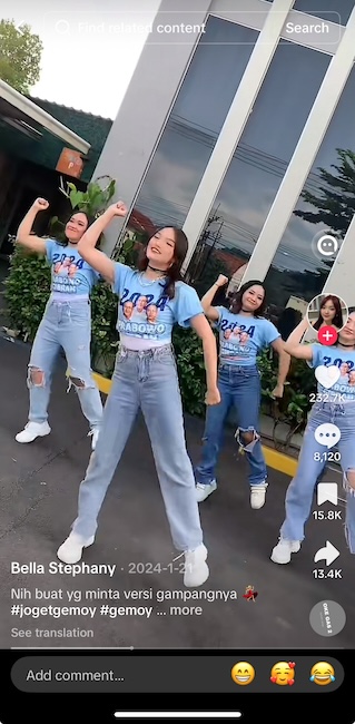 So did dancing. Prabowo’s trademark dance move during the campaign triggered an online trend in the form of a TikTok challenge, where users are challenged to post videos of themselves mimicking viral TikTok content. Influencers were used to popularise Prabowo’s ‘joget gemoy’ or ‘cute dance’ on TikTok, and through clever use of TikTok’s algorithms, soon the impression was created that the entire country supported Prabowo by joining the ‘joget gemoy’ trend – from school children to office workers, in cities and villages. This type of virality made it difficult to discern which part of the trend was spontaneous and which was coordinated by Prabowo’s official campaign team or unofficial buzzers.